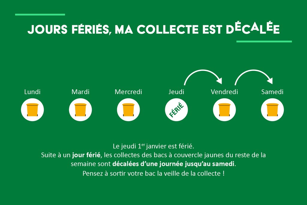 Le jeudi 1er janvier est férié, la collecte des bacs jaunes sera décalée au lendemain,et ce jusqu'au samedi.