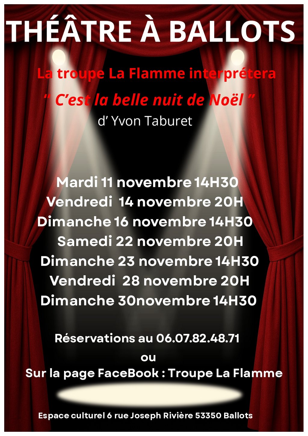 La troupe de théâtre "la flamme" vous propose des séances à Ballots de sa pièce " c'est la belle nuit de noël".