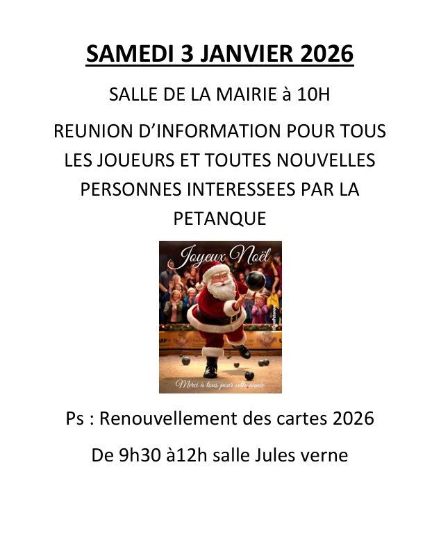 Pétanque: réunion d'information le 3 janvier 2026 salle du Conseil à partir de 10h