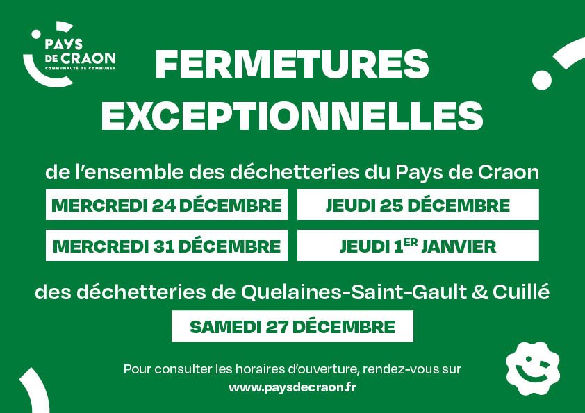 Nous vous informons que l’ensemble des déchetteries du Pays de Craon seront exceptionnellement fermées les mercredi 24 décembre, jeudi 25 décembre, mercredi 31 décembre 2025 et jeudi 1er janvier 2026.