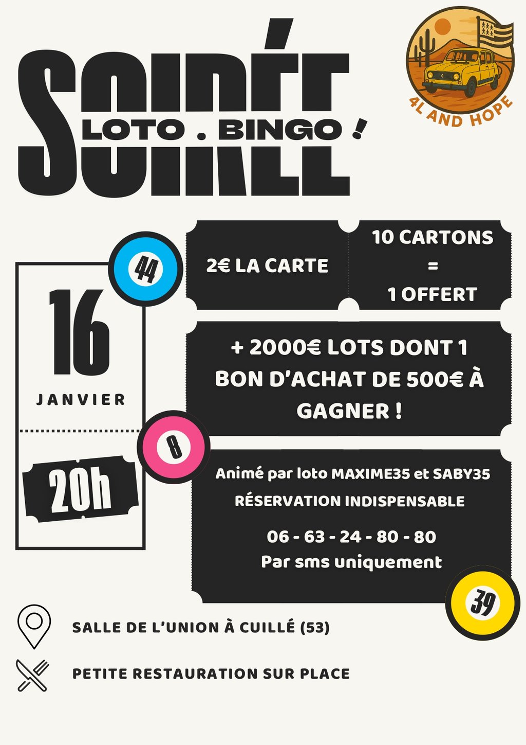 Soirée Loto organisée par l'association 4Land Hope le 16 janvier à la salle de l'Union à Cuillé.