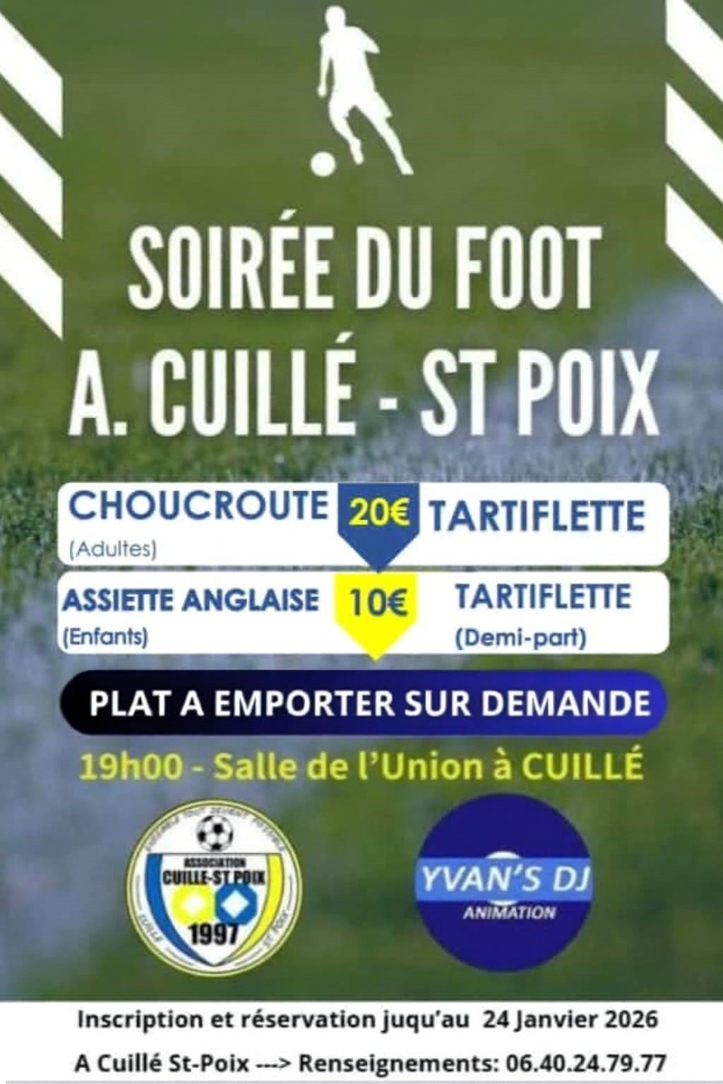 La soirée dansante du club de foot Cuillé Saint Poix qui se déroulera le 7 février prochain à la salle de l'Union à Cuillé à 19h.