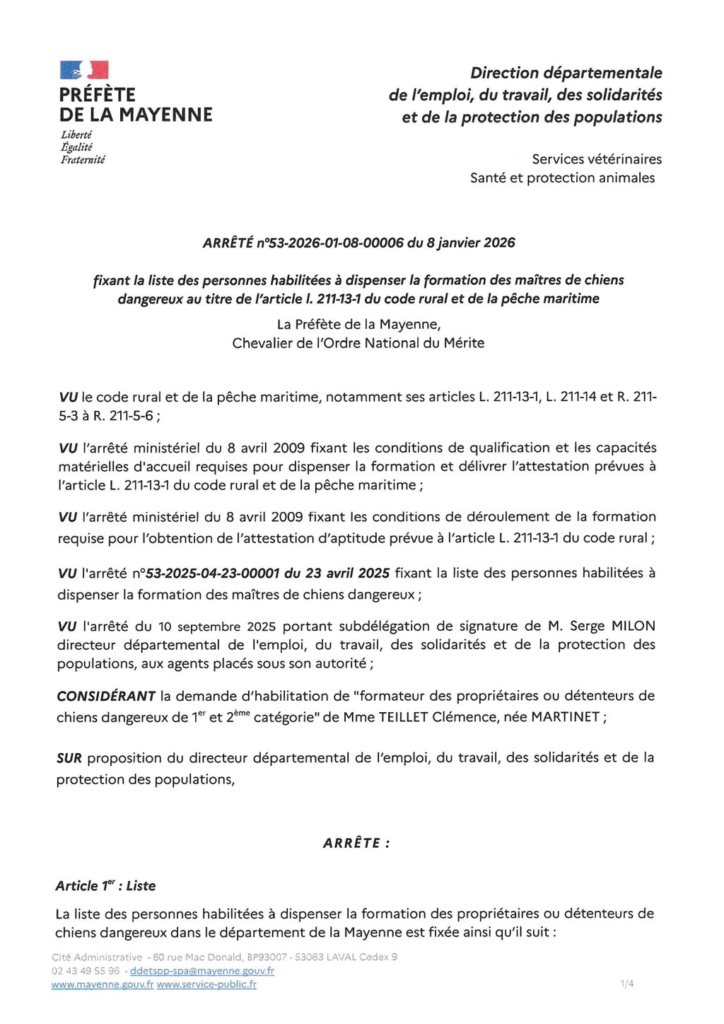 l'Arrêté préfectoral du 8 janvier 2026 fixant la liste des personnes habilitées à dispenser la formation des maîtres de chiens dangereux au titre de l'article L.211-13-1 du code rural et de la pêche maritime.