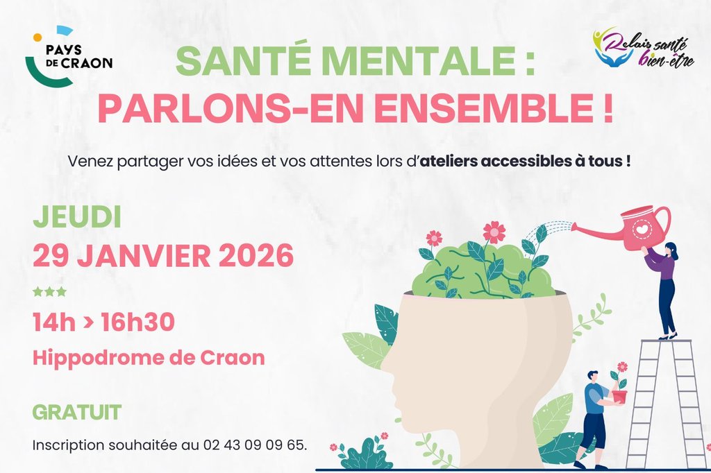 Dans le cadre du Contrat Local de Santé (CLS), la Communauté de Communes du Pays de Craon organise un temps participatif dédié à la santé mentale, le jeudi 29 janvier 2026 à partir de 14h, à l’hippodrome de Craon – salle Jean‑Louis Cousin. Ouvert à tous, cet après‑midi d’échanges prendra la forme d’ateliers participatifs. L’objectif est de recueillir les besoins, attentes et priorités des habitants en matière de santé mentale, afin de co‑construire, avec les habitants et les acteurs locaux, les futures actions du territoire.