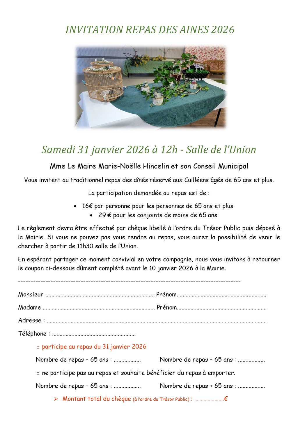 Le Repas des Aînés 2026 aura lieu le Samedi 31 janvier 2026 à 12h à la Salle de L'Union.