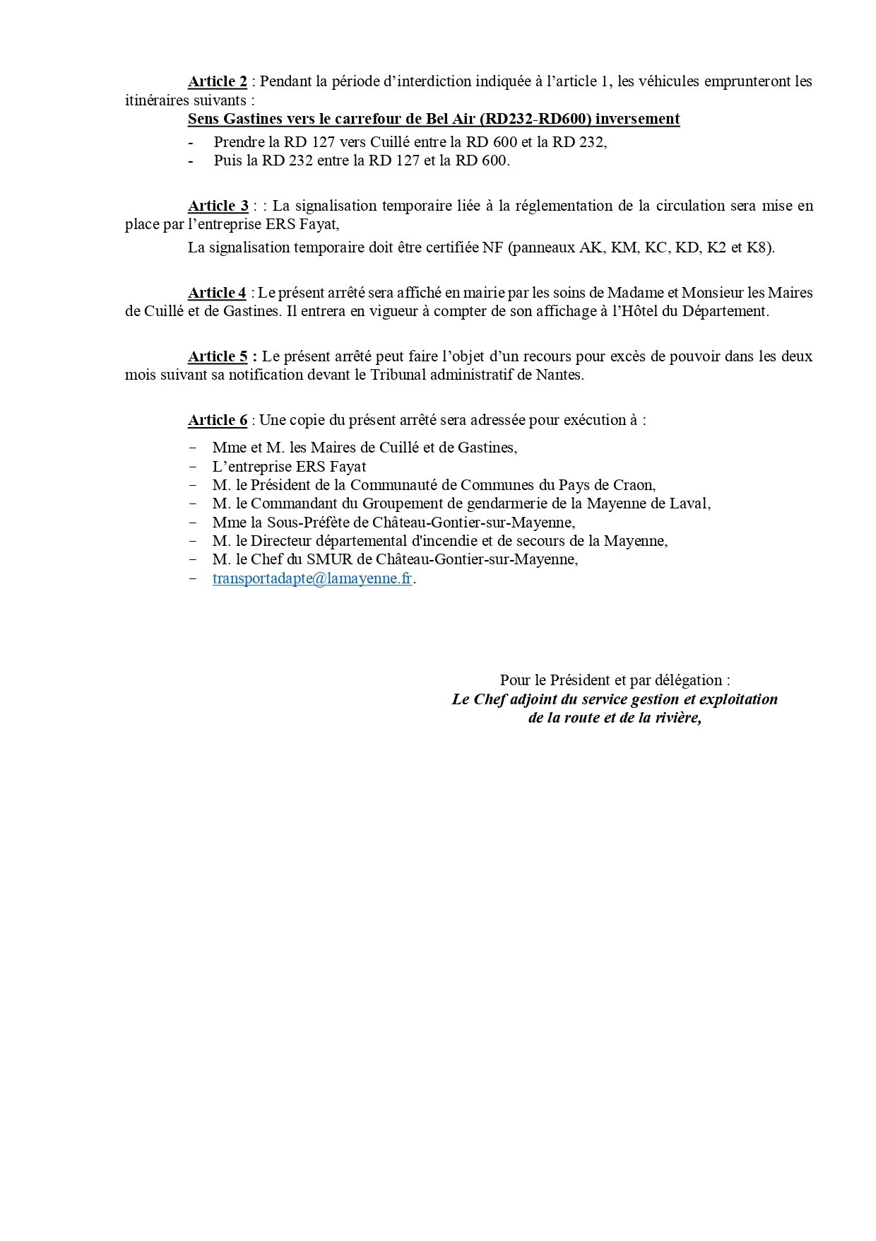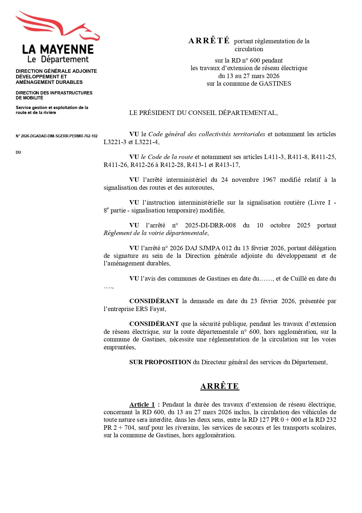 En vous adressant ci-joint un arrêté de circulation, concernant les travaux sur la RD600, commune de Gastines.