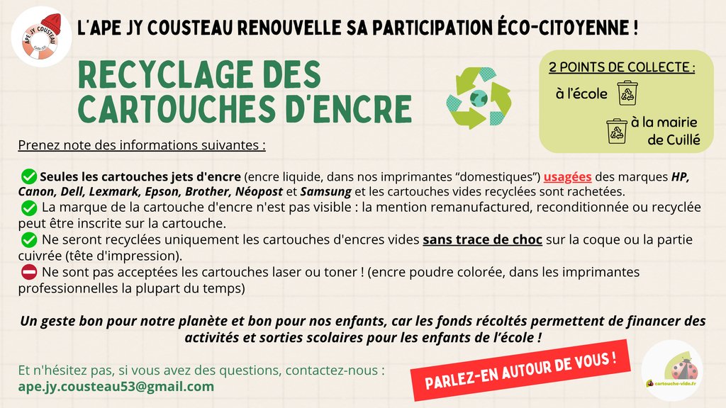 * collecte à l'année de cartouches d'encre d'imprimantes pour les recycler (à déposer à l'école ou au bar des sports de Cuillé - et en bon état)